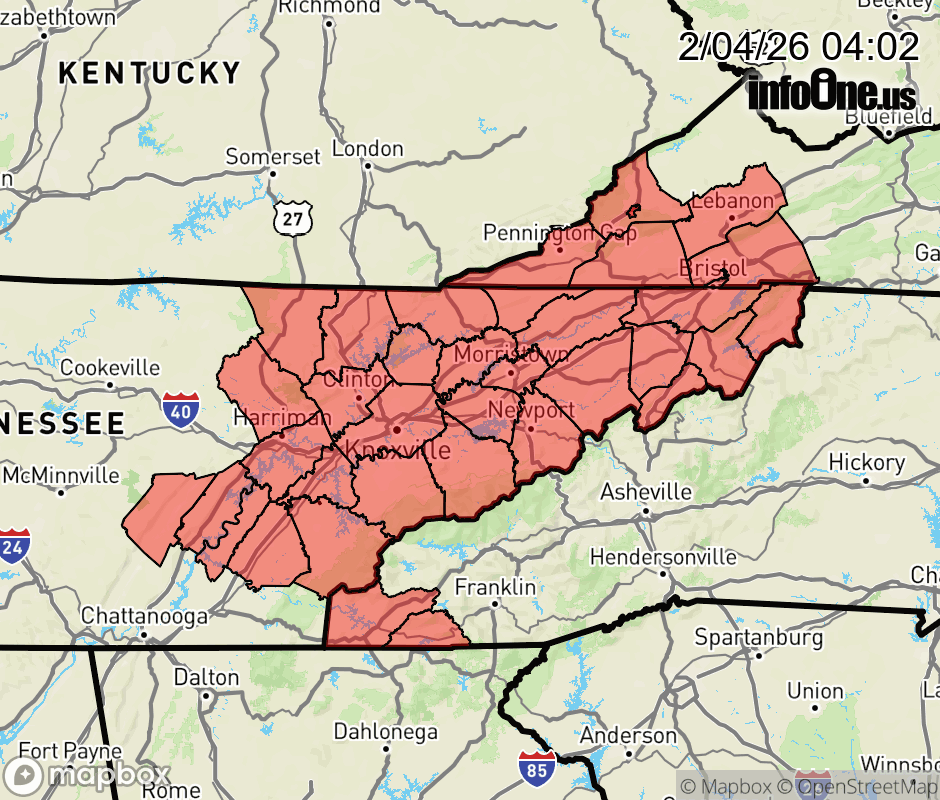 Dense Fog Advisory issued February 4 at 4:01AM EST until February 4 at 9:00AM EST by NWS Morristown TN * WHAT... Visibility one-quarter mile or less in dense fog. * WHERE... Portions of southwest North Carolina, east Tennessee, and southwest Virginia. * WHEN... Until 9 AM EST /8 AM CST/ this morning. * IMPACTS... Low visibility could make driving conditions hazardous. ![]() |
