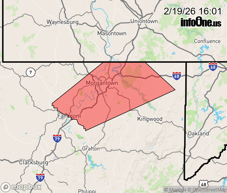 Canceled 2/19/26 4:10 PM Severe Thunderstorm Warning issued February 19 at 4:00PM EST until February 19 at 4:30PM EST by NWS Pittsburgh PA At 400 PM EST, a severe thunderstorm was located over Winfield, or near Fairmont, moving northeast at 50 mph. HAZARD...Quarter size hail. SOURCE...Radar indicated. IMPACT...Damage to vehicles is expected. Locations impacted include... Morgantown, Fairmont, Westover, Star City, Winfield, Barrackville, Granville, Brookhaven, Cassville, Rivesville, Grant Town, Reedsville, Masontown, Bruceton Mills, Browns Chapel, Cheat Lake, Booth, Osage and Everettville. ![]() |