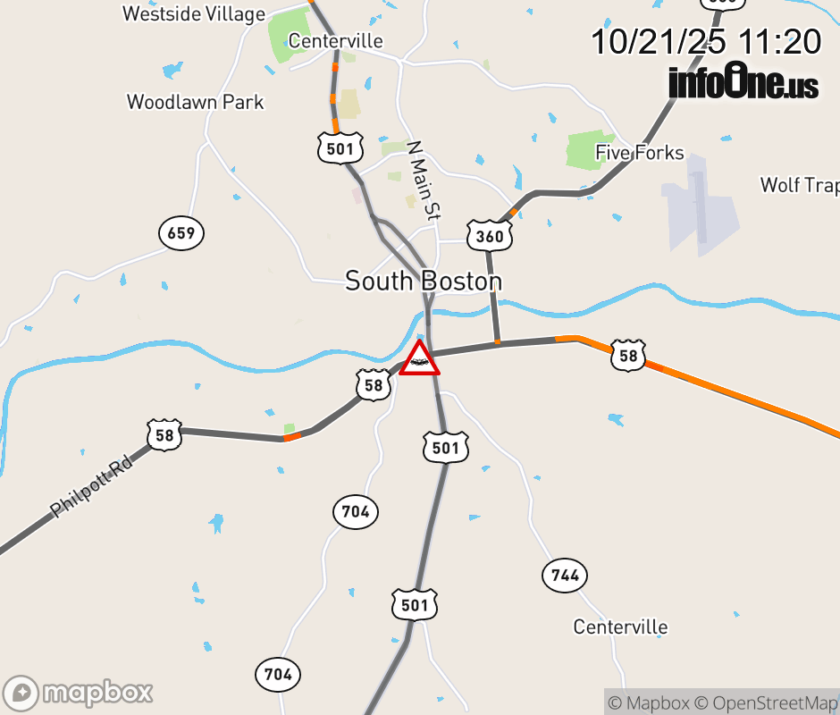 On US-58 in the County of Halifax, in the vicinity of Old Cluster Springs Rd; Riverdale Dr; Rt. 744N/S (Halifax County), motorists can expect delays due to a tractor trailer crash. The west right lane and right shoulder are closed. ![]() |