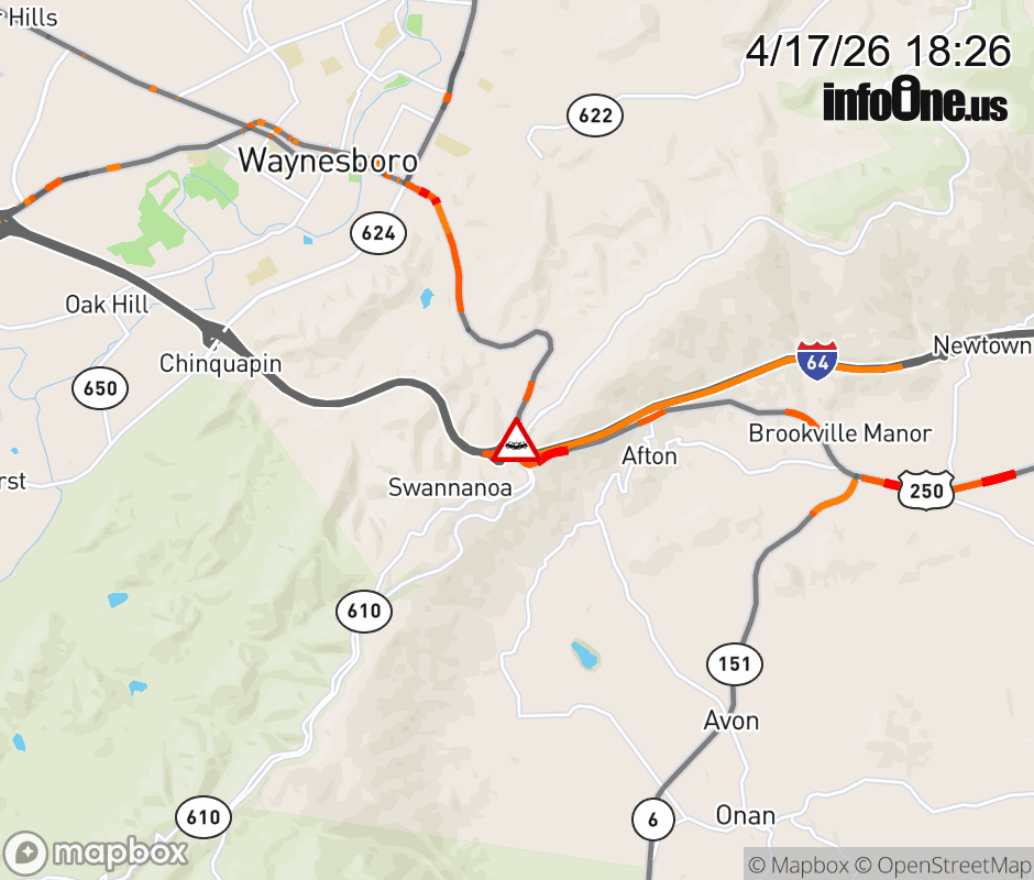 On US-250 West in the County of Augusta, in the vicinity of the ramp to I-64W and East, motorists can expect delays due to a vehicle crash. Updated: Fri 4/17/26 6:26 PM EDT ![]() Updated: Fri 4/17/26 6:26 PM EDT |