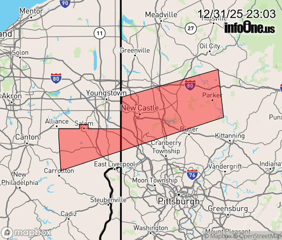 Canceled 12/31/25 11:18 PM Snow Squall Warning issued December 31 at 11:01PM EST until December 31 at 11:45PM EST by NWS Pittsburgh PA The National Weather Service in Pittsburgh has issued a * Snow Squall Warning for... Northeastern Carroll County in east central Ohio... Columbiana County in east central Ohio... Southern Mercer County in northwestern Pennsylvania... Southwestern Venango County in northwestern Pennsylvania... Western Armstrong County in west central Pennsylvania... Northern Butler County in west central Pennsylvania... Southwestern Clarion County in west central Pennsylvania... Northern Beaver County in western Pennsylvania... Lawrence County in western Pennsylvania... * Until 1145 PM EST. * At 1101 PM EST, a dangerous snow squall was located along a line from 9 miles west of Knox to 20 miles north of Carrollton, or along a line from 9 miles west of Knox to 18 miles west of Salem, moving south at 25 mph. HAZARD...Intense bursts of heavy snow and gusty winds leading to blowing snow and rapidly falling visibility. Wind gusts up to 35 mph. SOURCE...Doppler radar and road visibility sensors. IMPACT...Travel will become difficult and potentially dangerous within minutes. * Locations impacted include... New Castle, Salem, Grove City, Columbiana, East Palestine, Ellwood City, Homeacre-Lyndora, Shanor-Northvue, Slippery Rock, Lisbon, New Wilmington, Oakwood, Leetonia, New Castle Northwest, New Waterford, Big Beaver, Augusta, New Beaver, Pulaski and Ellport. This includes the following highways... Interstate 80 in Pennsylvania between mile markers 20 and 49. Interstate 79 in Pennsylvania between mile markers 92 and 117. Interstate 376 between mile markers 4 and 29. Pennsylvania Turnpike between mile markers 1 and 14. ![]() |
