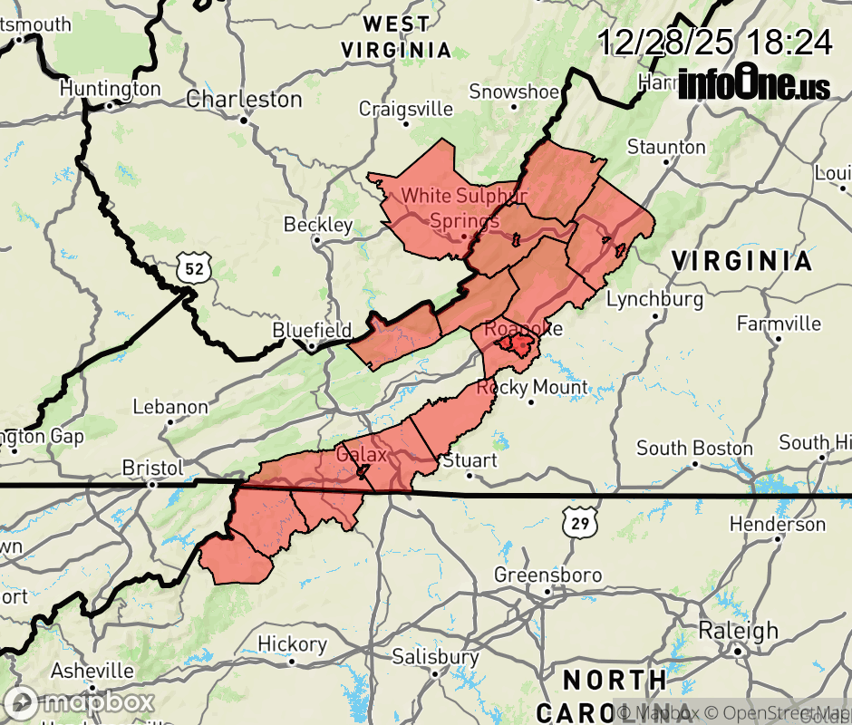 High Wind Warning issued December 28 at 6:22PM EST until December 30 at 12:00PM EST by NWS Blacksburg VA * WHAT... West winds 30 to 40 mph with gusts up to 60 mph expected, especially at higher elevations. * WHERE... Portions of northwest North Carolina, southwest and west central Virginia, and southeast West Virginia. * WHEN... From 7 AM Monday to noon EST Tuesday. * IMPACTS... Damaging winds will blow down trees and power lines. Widespread power outages are expected. Travel will be difficult, especially for high profile vehicles. ![]() |