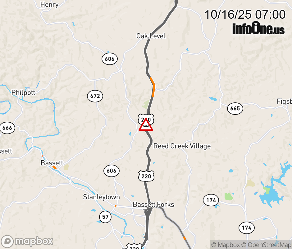 On US-220 North in the County of Henry, in the vicinity of Murry Hill Ln; Rt. 669E/W (Henry County); / MURRY HILL LA, motorists can expect delays due to a vehicle crash. Lane closures exist. ![]() |