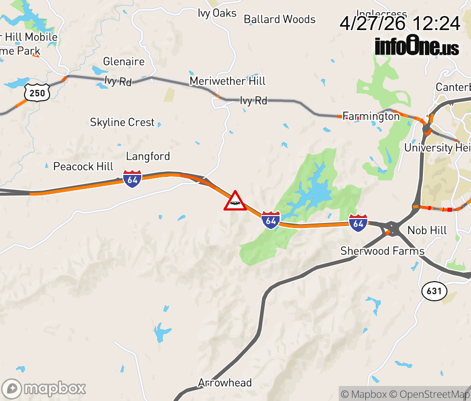 On I-64 East at mile marker 115.2 in the County of Albemarle, motorists can expect delays due to a vehicle crash. Traffic backups are approximately 1.0 mile. Updated: Mon 4/27/26 12:24 PM EDT ![]() Updated: Mon 4/27/26 12:24 PM EDT |