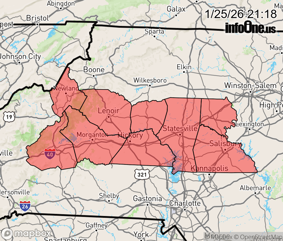 Canceled 1/26/26 3:54 AM Ice Storm Warning issued January 25 at 9:17PM EST until January 26 at 1:00PM EST by NWS Greenville-Spartanburg SC * WHAT... Treacherous conditions due to earlier sleet and freezing rain. Winds gusting as high as 45 mph. * WHERE... The northern mountains, northern foothills, and northwest Piedmont of North Carolina. * WHEN... Until 1 PM EST Monday. * IMPACTS... Numerous power outages are likely due to the weight of the ice and snow on tree limbs and power lines. The outages could last for days in some areas. Falling trees and limbs could pose a threat to life and property. Ice and snow covered roadways will become treacherous and impassable. The hazardous conditions could impact the Monday morning commute. ![]() |