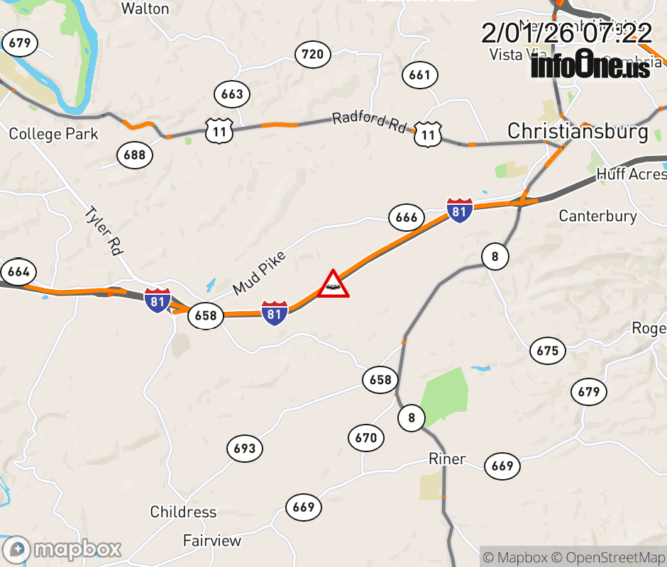 On I-81 at mile marker 111.6 in the County of Montgomery, motorists can expect delays due to a tractor trailer crash. The north left shoulder and left lane are closed. Updated: Sun 2/1/26 7:22 AM EST ![]() Updated: Sun 2/1/26 7:22 AM EST |