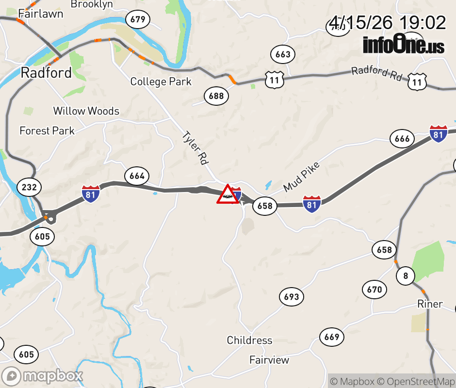 On I-81 at mile marker 109 in the County of Montgomery, motorists can expect delays due to a vehicle crash. The south exit ramp narrows. Updated: Wed 4/15/26 7:02 PM EDT ![]() |