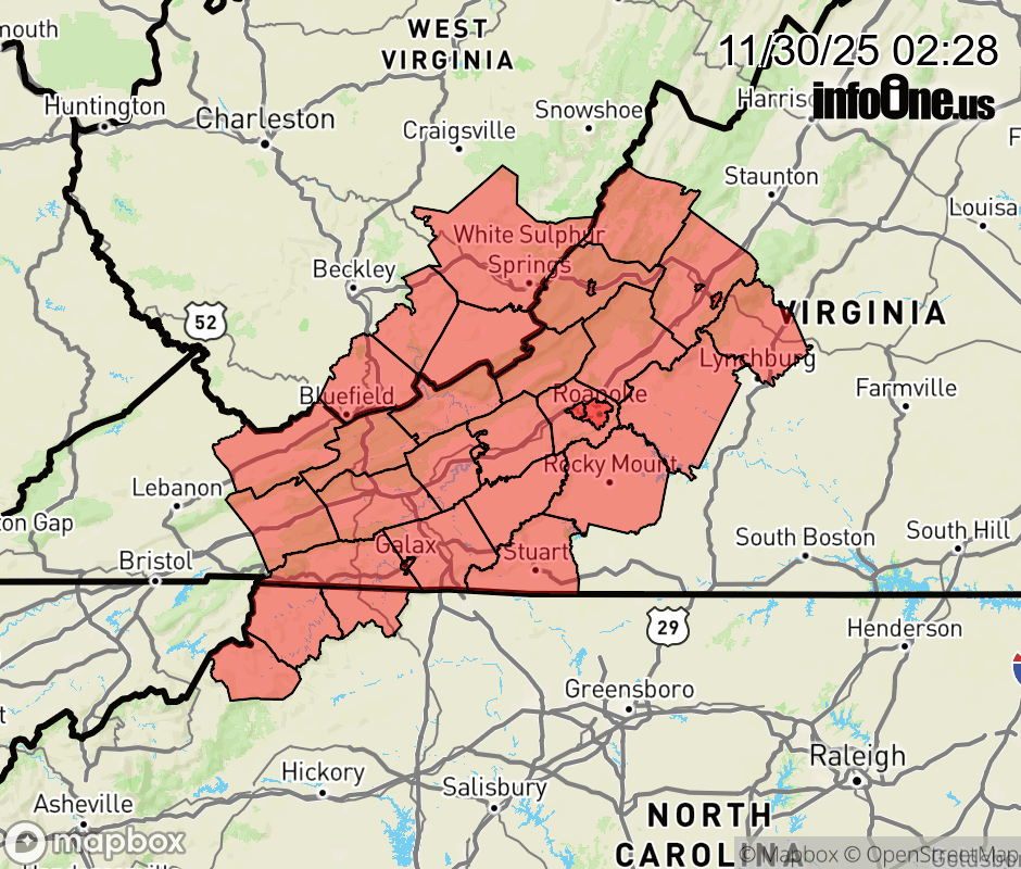 Canceled 11/30/25 11:56 AM Winter Weather Advisory issued November 30 at 2:27AM EST until November 30 at 12:00PM EST by NWS Blacksburg VA * WHAT... Freezing expected. Ice accumulations less than a tenth of an inch. * WHERE... Portions of northwest North Carolina, central, south central, southwest, and west central Virginia, and southeast West Virginia. * WHEN... Until noon EST today. * IMPACTS... Some roads, especially bridges and overpasses, will likely become slick and hazardous. Very slippery sidewalks are also possible. ![]() |
