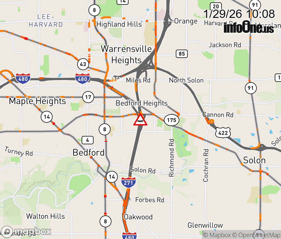 The left lane is blocked on I-271 South beyond Rockside Rd, due to a crash. Updated: Thu 1/29/26 10:08 AM EST ![]() Updated: Thu 1/29/26 10:08 AM EST |