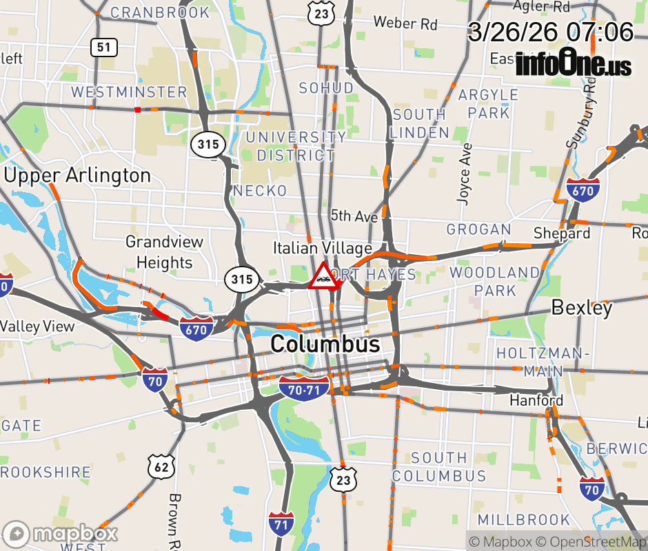 The right lane is blocked on I-670 West beyond US 23 North/Fourth St, due to a disabled vehicle. Updated: Thu 3/26/26 7:06 AM EDT ![]() Updated: Thu 3/26/26 7:06 AM EDT |