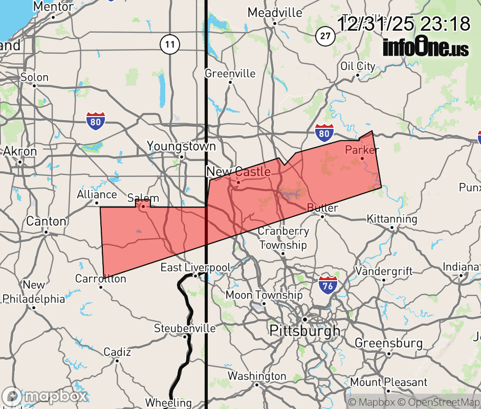 Canceled 12/31/25 11:45 PM Snow Squall Warning issued December 31 at 11:17PM EST until December 31 at 11:45PM EST by NWS Pittsburgh PA At 1117 PM EST, a dangerous snow squall was located along a line from 9 miles southwest of Knox to 14 miles north of Carrollton, moving south at 25 mph. HAZARD...Intense bursts of heavy snow and gusty winds leading to blowing snow and rapidly falling visibility. Wind gusts up to 35 mph. SOURCE...Doppler radar and webcams. IMPACT...Travel will become difficult and potentially dangerous within minutes. Locations impacted include... New Castle, Salem, Columbiana, East Palestine, Ellwood City, Homeacre-Lyndora, Shanor-Northvue, Slippery Rock, Lisbon, Oakwood, Leetonia, New Castle Northwest, New Waterford, Big Beaver, Augusta, New Beaver, Ellport, Prospect, Bessemer and Chicora. This includes the following highways... Interstate 80 in Pennsylvania between mile markers 43 and 45...and between mile markers 47 and 48. Interstate 79 in Pennsylvania between mile markers 92 and 110. Interstate 376 between mile markers 12 and 29. Pennsylvania Turnpike between mile markers 1 and 14. ![]() |