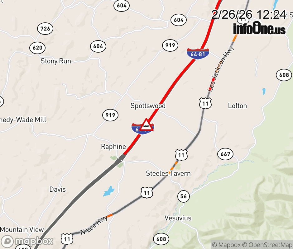 On I-81 South at mile marker 206.4 in the County of Augusta, motorists can expect delays due to a tractor trailer crash. Traffic backups are approximately 5.0 miles. Updated: Thu 2/26/26 12:24 PM EST ![]() Updated: Thu 2/26/26 12:24 PM EST |