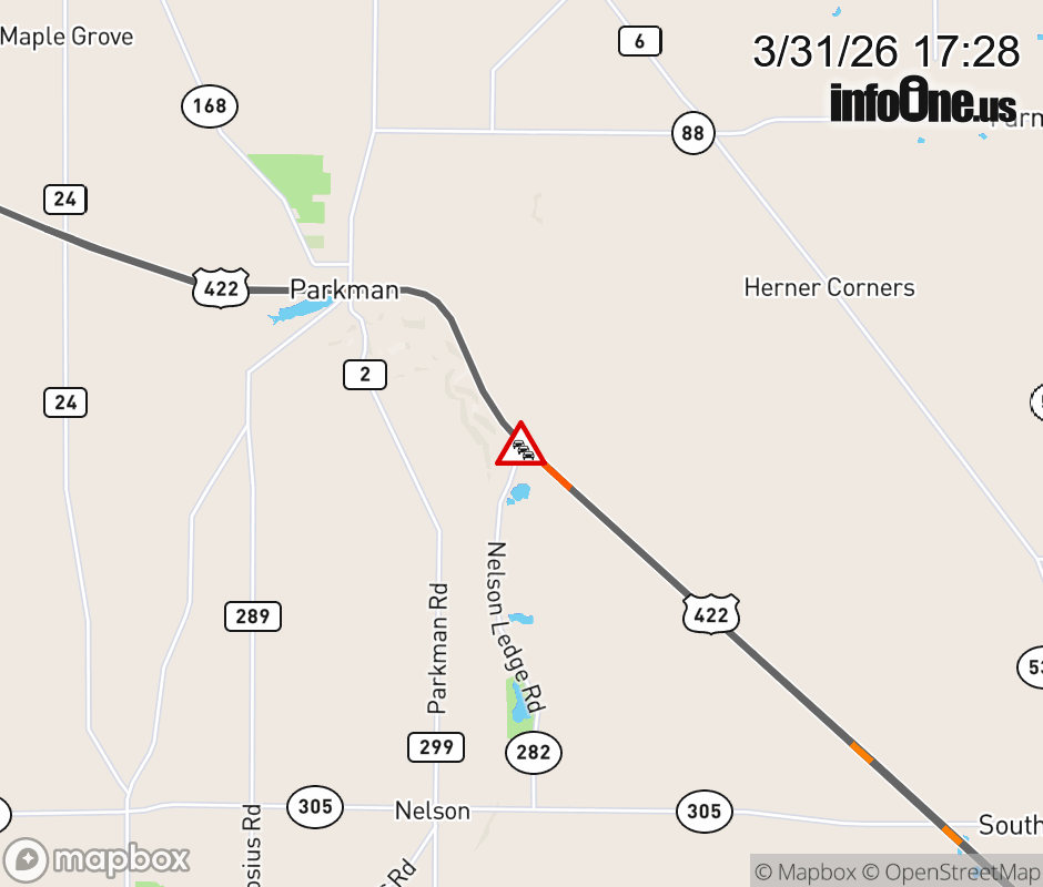 Expect lane closures on US-422 in both directions from Nelson Ledge Rd to SR-305. (MM: 19.4), due to utility lines debris on roadway. Updated: Tue 3/31/26 5:28 PM EDT ![]() Updated: Tue 3/31/26 5:28 PM EDT |