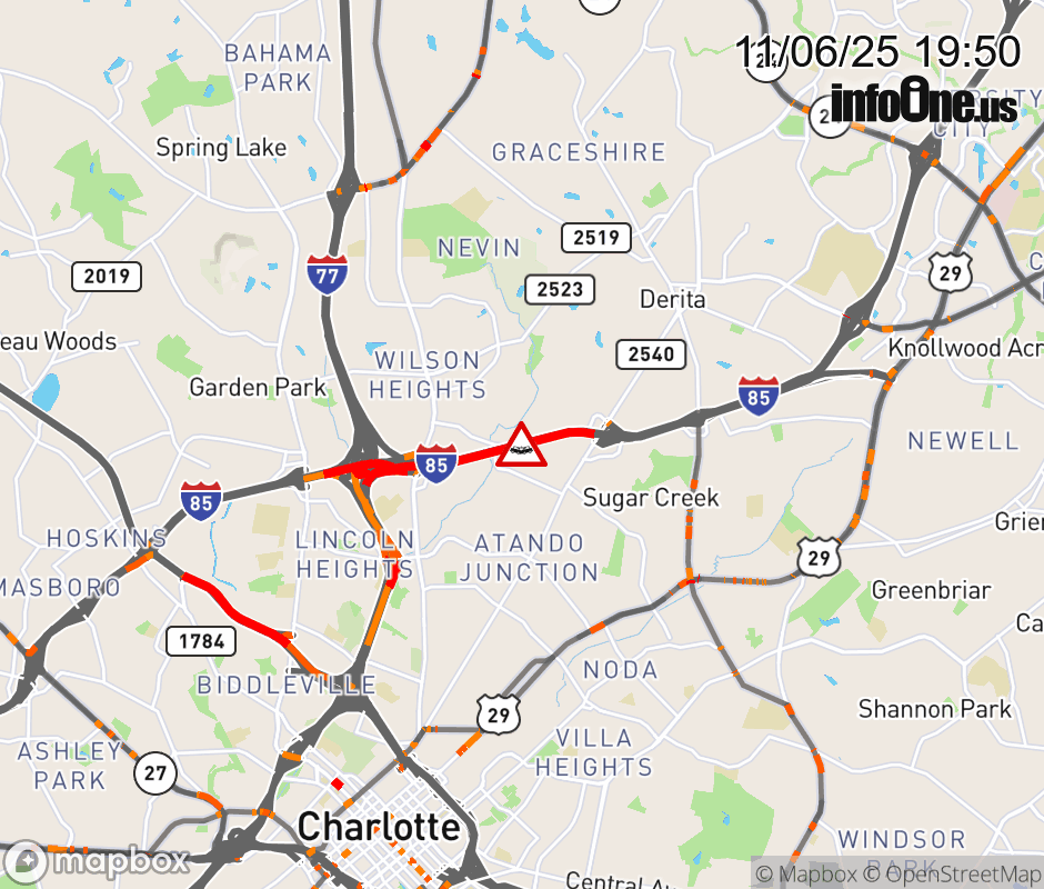 The right lane is closed past Exit 39 (Statesville Avenue). Updated: Thu 11/6/25 7:50 PM EST ![]() Updated: Thu 11/6/25 7:50 PM EST |
