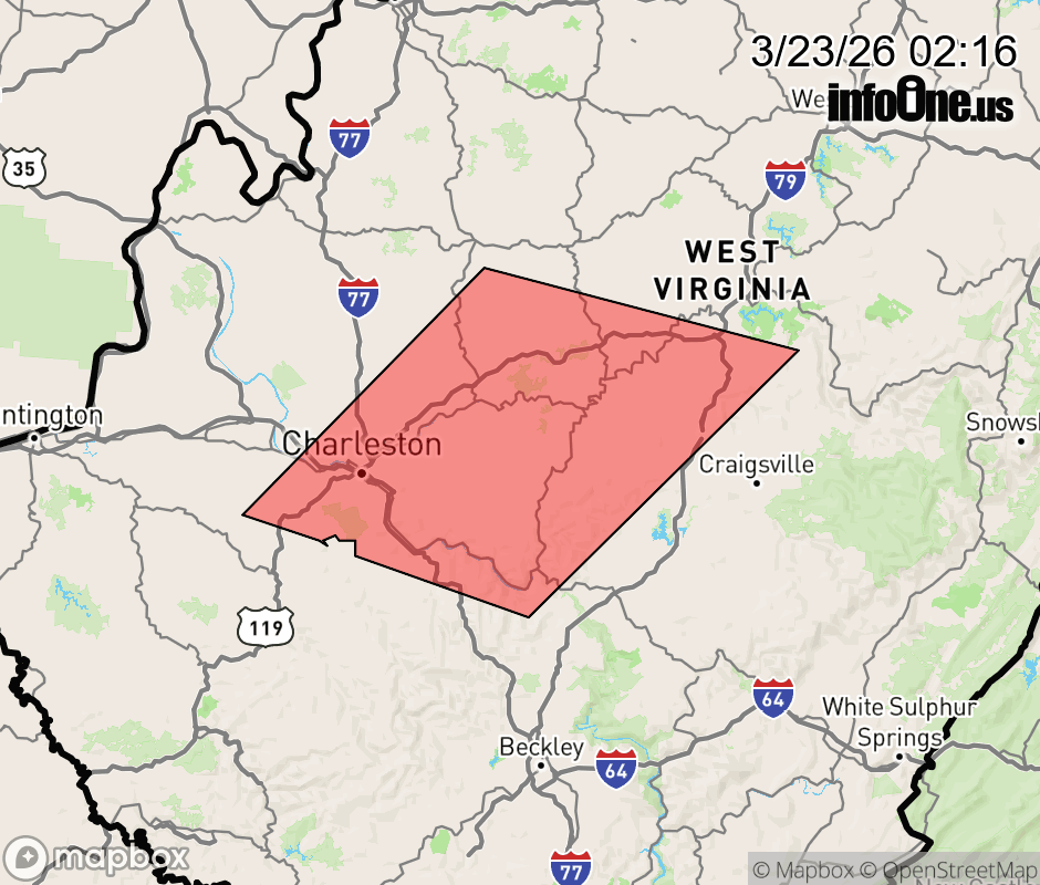 Canceled 3/23/26 2:45 AM Special Weather Statement issued March 23 at 2:14AM EDT by NWS Charleston WV At 214 AM EDT, Doppler radar was tracking strong thunderstorms along a line extending from near Amma to near South Charleston. Movement was east at 50 mph. HAZARD...Wind gusts up to 50 mph. SOURCE...Radar indicated. IMPACT...Gusty winds could knock down tree limbs and blow around unsecured objects. Locations impacted include... Charleston, Clay, Jefferson, South Charleston, St. Albans, Dunbar, Sissonville, Montgomery, Chesapeake, Marmet, Belle, Clendenin, Cedar Grove, East Bank, Glasgow, Smithers, Gauley Bridge, Pratt, Pinch, and Birch River. This includes the following highways... Interstate 79 between mile markers 1 and 59. Interstate 77 in West Virginia between mile markers 96 and 112. Interstate 64 in West Virginia between mile markers 50 and 57. West Virginia Turnpike between mile markers 74 and 95. Route 119 between mile markers 66 and 80. Route 19 between mile markers 50 and 68. ![]() |