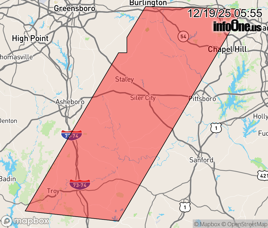 Canceled 12/19/25 6:30 AM Severe Thunderstorm Warning issued December 19 at 5:54AM EST until December 19 at 6:30AM EST by NWS Raleigh NC At 553 AM EST, severe thunderstorms were located along a line extending from near Graham to near Seagrove to near Troy, moving east at 45 mph. HAZARD...60 mph wind gusts. SOURCE...Radar indicated. IMPACT...Expect damage to roofs, siding, and trees. Locations impacted include... Chapel Hill, Burlington, Graham, Hillsborough, Troy, Siler City, North Carolina Zoo, Carrboro, Mebane, and Biscoe. This includes the following highways... Interstate 85 between Mile Markers 163 and 170. Interstate 40 between Mile Markers 144 and 155, between Mile Markers 160 and 162, and between Mile Markers 259 and 266. Interstate 73 between Mile Markers 42 and 65. ![]() |