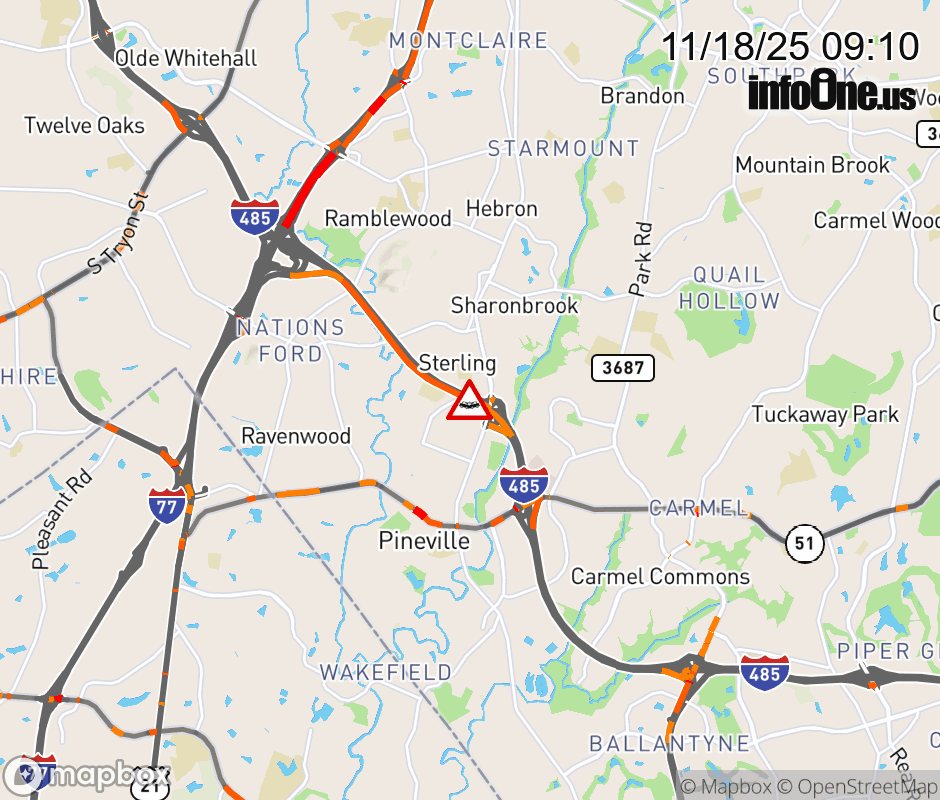 The right center lane is closed before Exit 65 (South Blvd). Updated: Tue 11/18/25 9:10 AM EST ![]() Updated: Tue 11/18/25 9:10 AM EST |