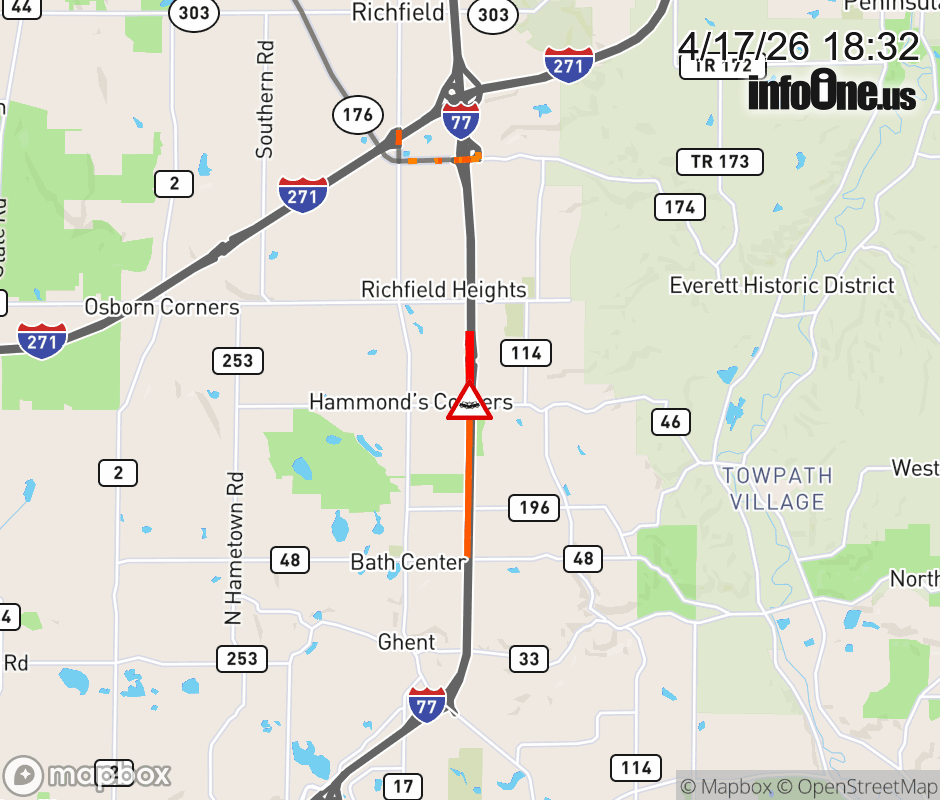 The left lane is blocked on I-77 South beyond Summit County Rest Area 4-32, due to a crash. Updated: Fri 4/17/26 6:32 PM EDT ![]() Updated: Fri 4/17/26 6:32 PM EDT |