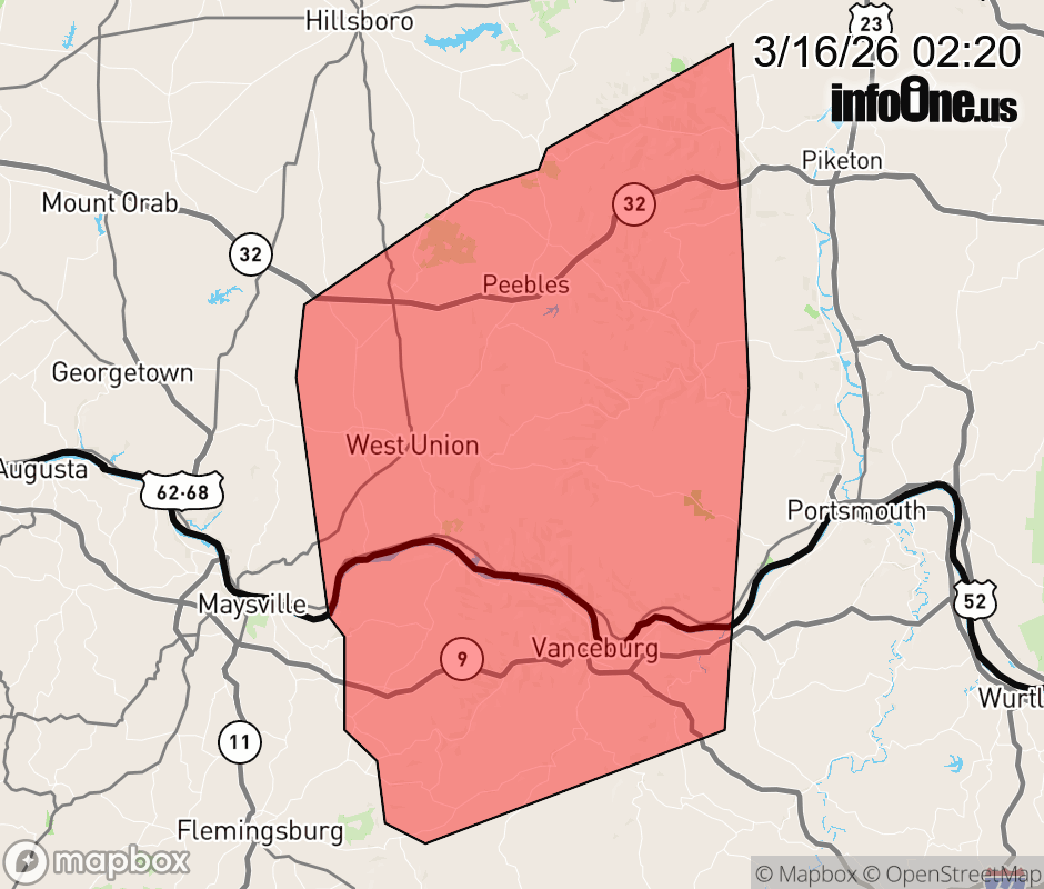 Canceled 3/16/26 2:30 AM Severe Thunderstorm Warning issued March 16 at 2:19AM EDT until March 16 at 2:45AM EDT by NWS Wilmington OH At 218 AM EDT, severe thunderstorms were located along a line extending from Winchester to near Manchester to Mount Carmel, moving northeast at 55 mph. HAZARD...60 mph wind gusts. SOURCE...Radar indicated. IMPACT...Expect damage to trees and power lines. Locations impacted include... West Union, Manchester, Peebles, Vanceburg, Winchester, Seaman, Pike Lake, Kincaid Springs, Camp Dix, Tollesboro, Rome, Blue Creek, Rarden, Cherry Fork, Sinking Spring, Otway, Concord, Trinity, Dunkinsville, and May Hill. ![]() |