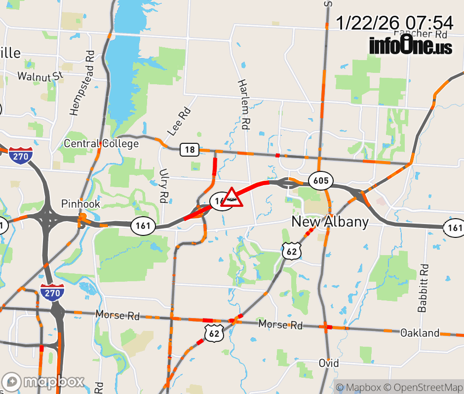 The right shoulder is blocked on SR-161 East beyond Hamilton Rd, due to a crash. Updated: Thu 1/22/26 7:54 AM EST ![]() Updated: Thu 1/22/26 7:54 AM EST |