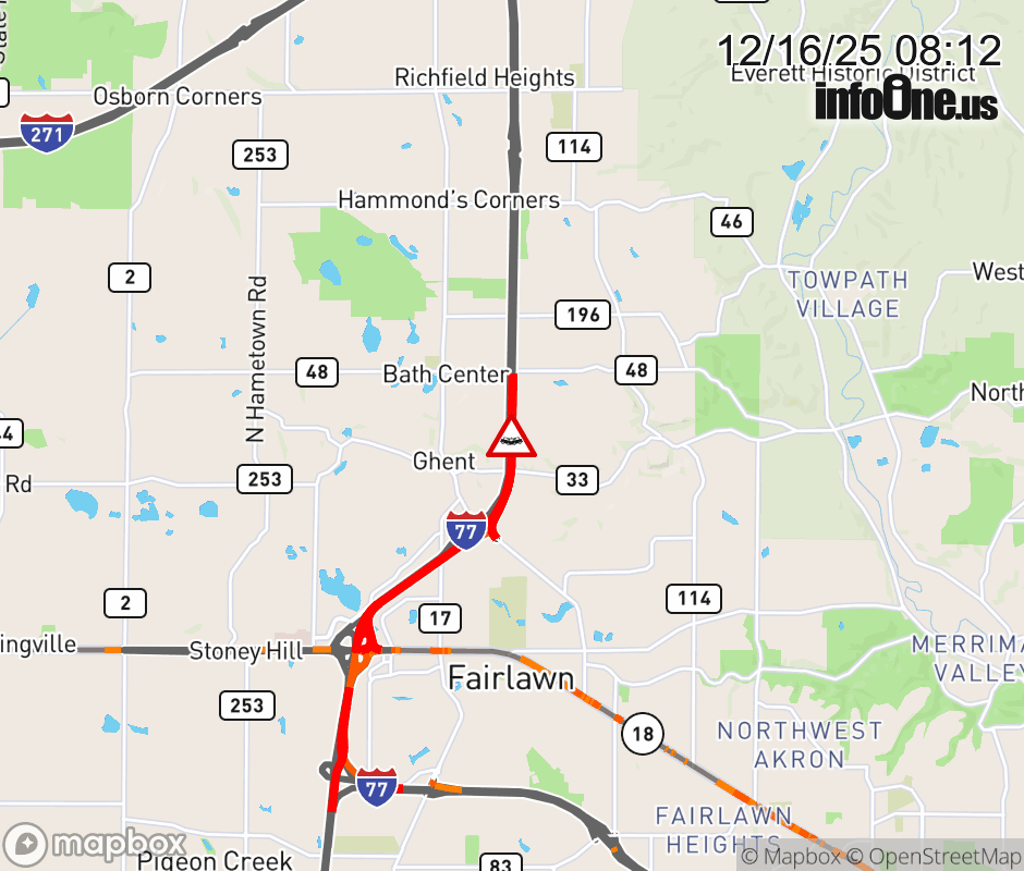 The right shoulder is blocked on I-77 North beyond Ghent Rd, due to a crash. Updated: Tue 12/16/25 8:12 AM EST ![]() Updated: Tue 12/16/25 8:12 AM EST |