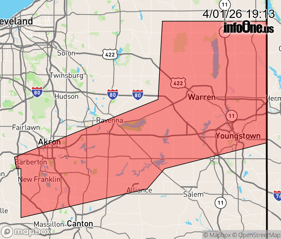 Canceled 4/1/26 10:44 PM Flood Advisory issued April 1 at 7:11PM EDT until April 1 at 10:45PM EDT by NWS Cleveland OH * WHAT... Urban and small stream flooding caused by excessive rainfall continues. * WHERE... A portion of northeast Ohio, including the following counties, Mahoning, Portage, Stark, Summit and Trumbull. * WHEN... Until 1045 PM EDT. * IMPACTS... Minor flooding in low-lying and poor drainage areas. Ponding of water in urban or other areas is occurring or is imminent. * ADDITIONAL DETAILS... - At 711 PM EDT, trained weather spotters reported flooding in the advisory area. This will cause urban and small stream flooding. Between 0.5 and 1 inch of rain has fallen. - Some locations that will experience flooding include... Akron, Youngstown, Warren, Ravenna, Boardman, Kent, Barberton, Green, Alliance, Niles, Tallmadge, North Canton, Campbell, Hubbard, Canfield, Cortland, Newton Falls, Mogadore, Lordstown and Hartville. - Please visit www.weather.gov/safety/flood for flood safety and preparedness information. ![]() |