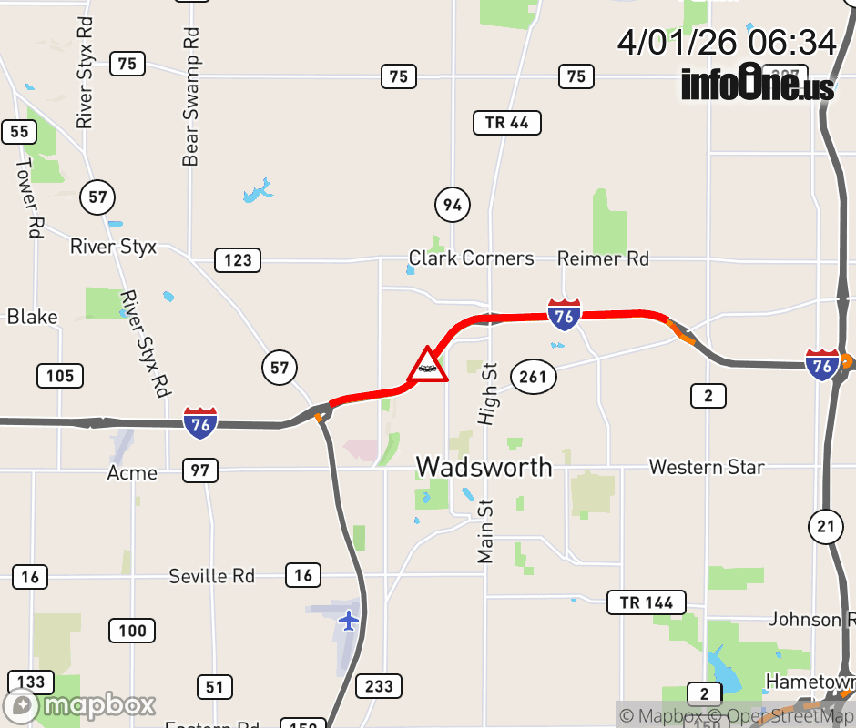 The left lane is closed on I-76/US-224 West beyond SR-94, due to a crash. Updated: Wed 4/1/26 6:34 AM EDT ![]() Updated: Wed 4/1/26 6:34 AM EDT |