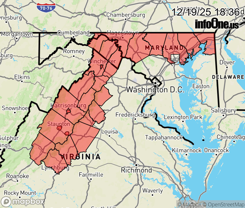 Canceled 12/19/25 8:08 PM Wind Advisory issued December 19 at 6:35PM EST until December 19 at 10:00PM EST by NWS Baltimore MD/Washington DC * WHAT... West winds 15 to 25 mph with gusts up to 50 mph. * WHERE... Portions of north central, northeast, and northern Maryland, central, northwest, and western Virginia, and panhandle West Virginia. * WHEN... Until 10 PM EST this evening. * IMPACTS... Gusty winds will blow around unsecured objects. Tree limbs could be blown down and a few power outages may result. ![]() |