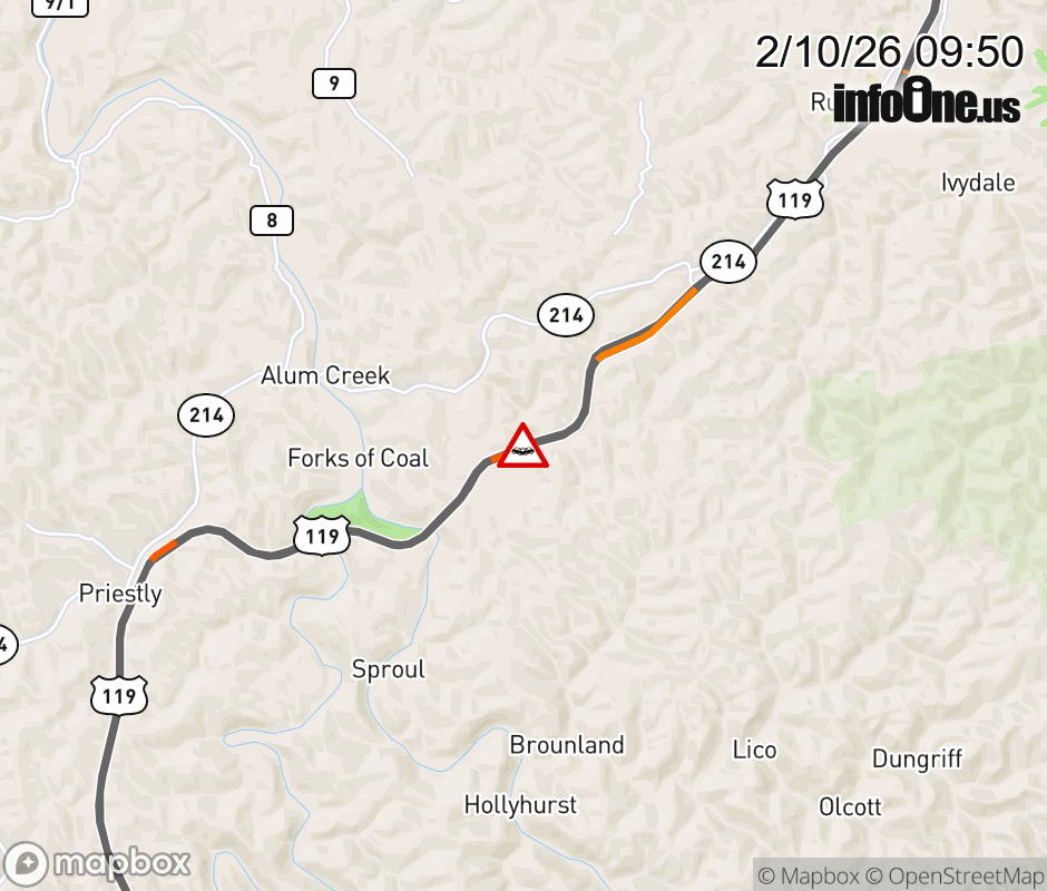 Vehicle Crash on US-119 SB at Alum Creek Road. Updated: Tue 2/10/26 9:50 AM EST ![]() Updated: Tue 2/10/26 9:50 AM EST |