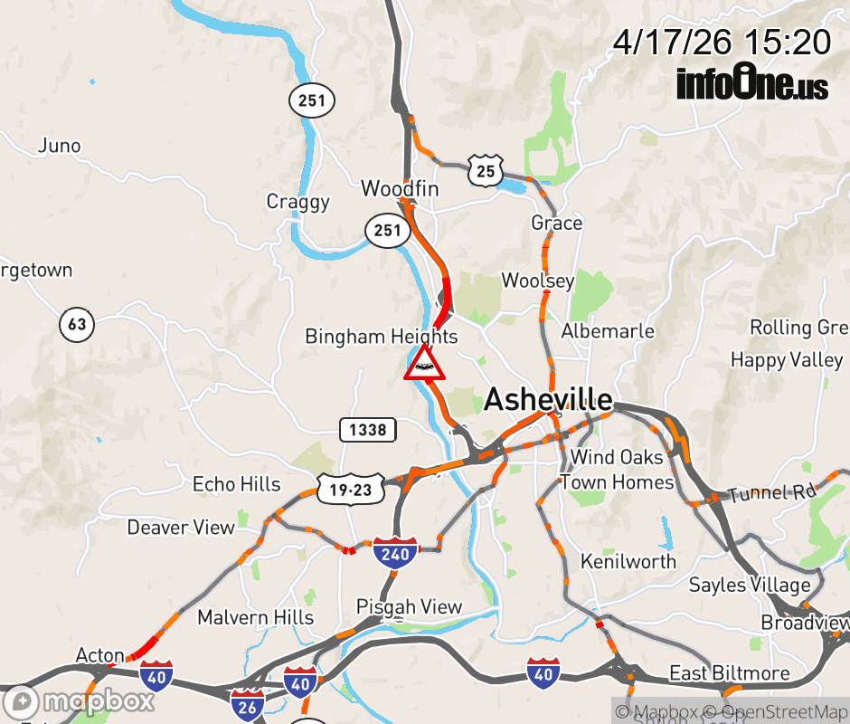 The right shoulder is closed after Exit 25, NC 251 Riverside Dr. Updated: Fri 4/17/26 3:20 PM EDT ![]() Updated: Fri 4/17/26 3:20 PM EDT |