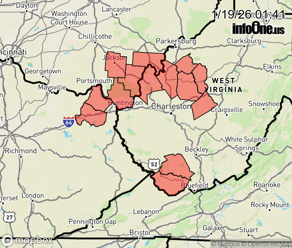 Canceled 1/19/26 10:45 AM Cold Weather Advisory issued January 19 at 1:40AM EST until January 20 at 12:00PM EST by NWS Charleston WV * WHAT... Very cold wind chills as low as 6 below expected. * WHERE... Portions of northeast Kentucky, southeast Ohio, and central, northern, southern, and western West Virginia. * WHEN... From 9 PM this evening to noon EST Tuesday. * IMPACTS... The cold wind chills as low as 5 below zero could result in hypothermia if precautions are not taken. ![]() |