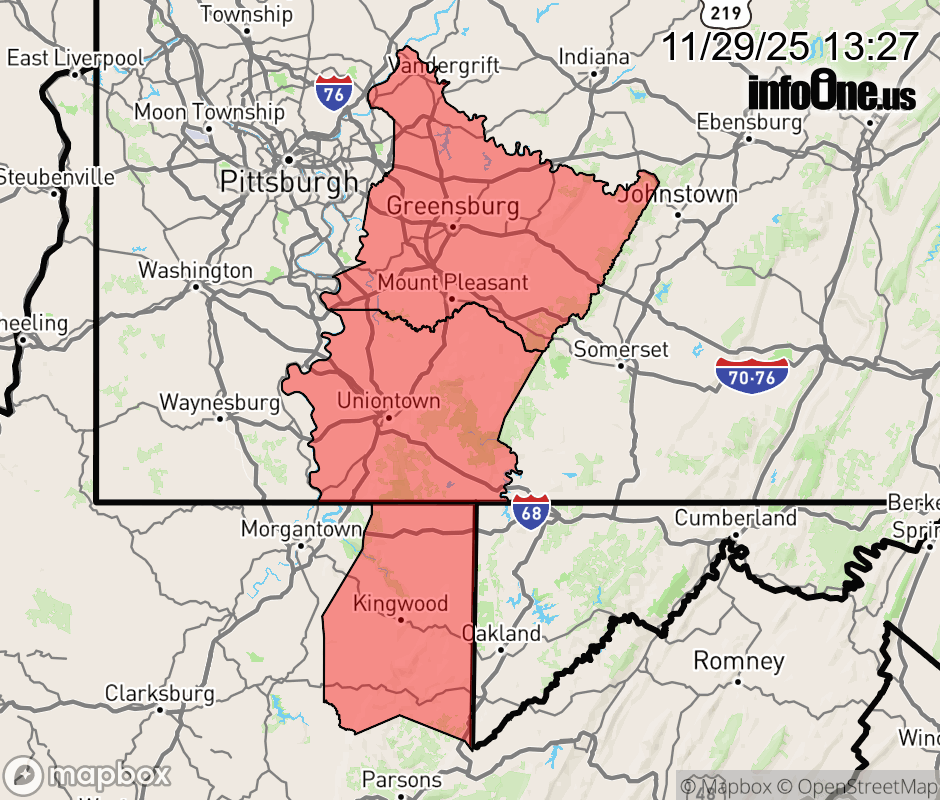 Canceled 11/29/25 7:12 PM Winter Weather Advisory issued November 29 at 1:25PM EST until November 30 at 12:00PM EST by NWS Pittsburgh PA * WHAT... Mixed precipitation expected. Total snow accumulations up to one inch and ice accumulations around a light glaze, particularly at higher elevations. * WHERE... In Pennsylvania, Higher Elevations of Fayette and Higher Elevations of Westmoreland Counties. In West Virginia, Eastern Preston County. * WHEN... From 3 AM to noon EST Sunday. * IMPACTS... Plan on slippery road conditions. ![]() |