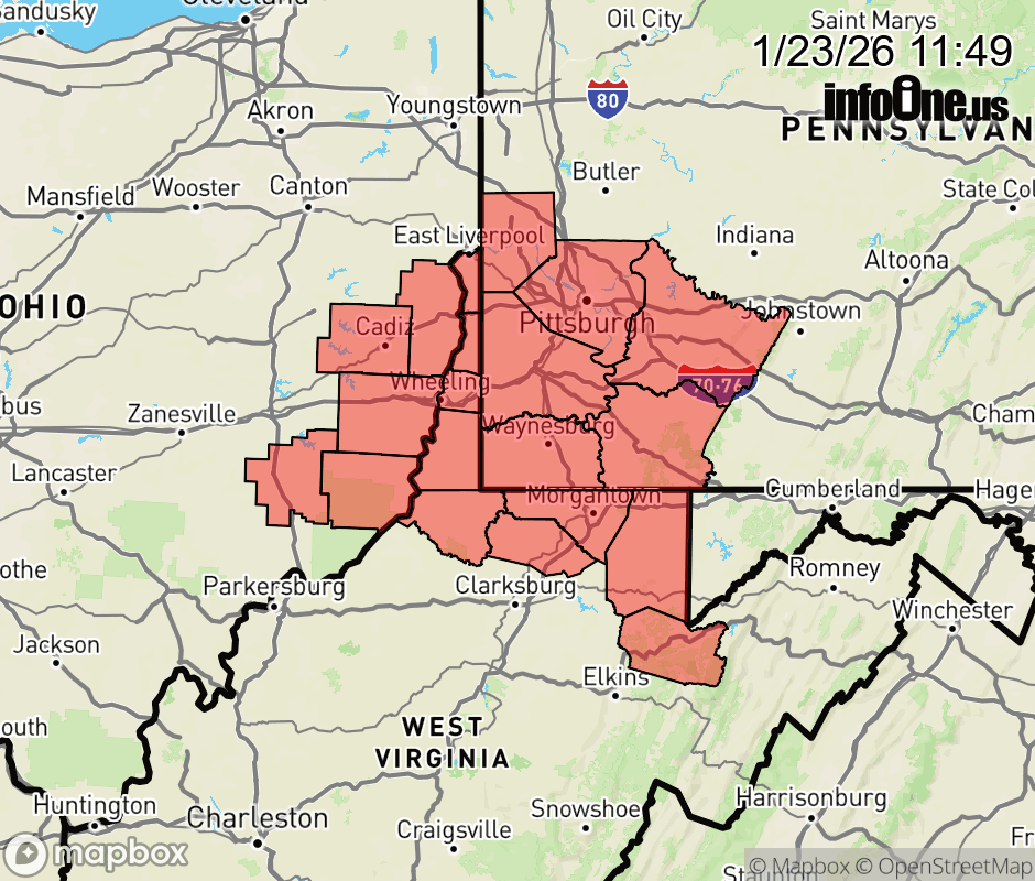 Canceled 1/23/26 1:00 PM Cold Weather Advisory issued January 23 at 11:48AM EST until January 24 at 7:00AM EST by NWS Pittsburgh PA * WHAT... Very cold wind chills between 10 below and 20 below zero expected. * WHERE... Portions of east central Ohio, southwest and western Pennsylvania, and northern and the northern panhandle of West Virginia. * WHEN... From 4 PM this afternoon to 7 AM EST Saturday. * IMPACTS... The cold wind chills as low as 20 below zero could result in hypothermia if precautions are not taken. ![]() |