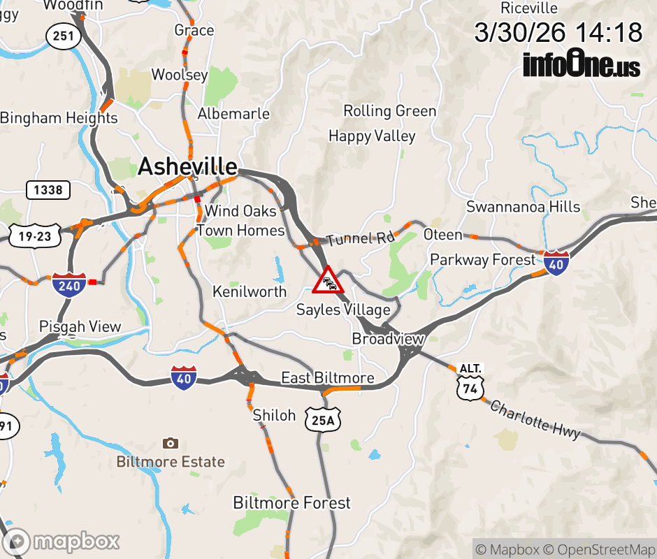 The right lane is closed half mile after Exit 7, US 70 (Tunnel Road) for a brush fire. ![]() |