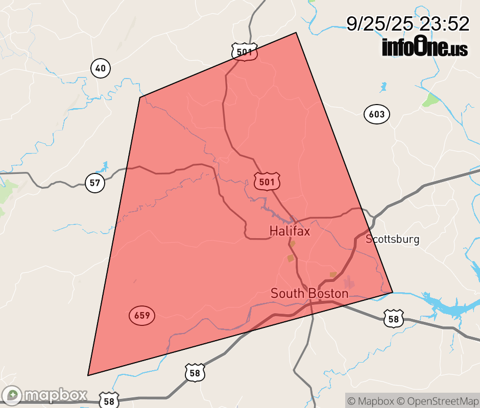 Canceled 9/26/25 12:15 AM Special Weather Statement issued September 25 at 11:51PM EDT by NWS Blacksburg VA At 1151 PM EDT, Doppler radar was tracking a strong thunderstorm over Ingram, moving east at 35 mph. HAZARD...Wind gusts up to 40 mph and pea size hail. SOURCE...Radar indicated. IMPACT...Gusty winds could knock down tree limbs and blow around unsecured objects. Locations impacted include... South Boston... Halifax... Ingram... Nathalie... Leda... Crystal Hill... and Elmo. ![]() |