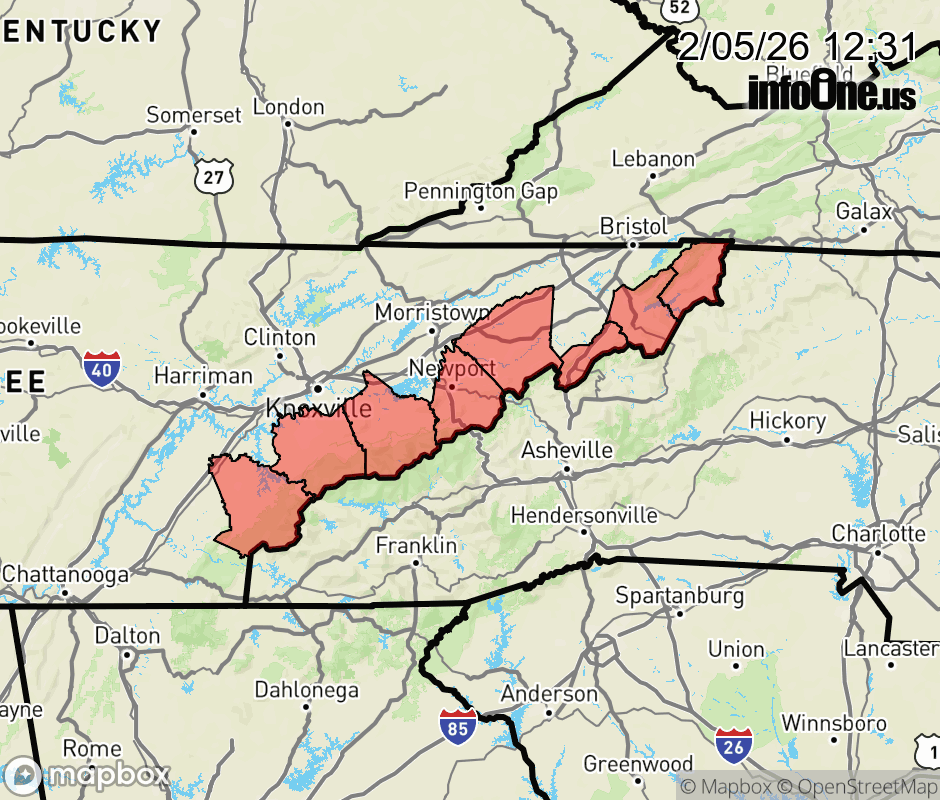 Canceled 2/5/26 9:24 PM Wind Advisory issued February 5 at 12:30PM EST until February 7 at 7:00PM EST by NWS Morristown TN * WHAT... Northwest winds 15 to 25 mph with gusts up to 45 mph expected. * WHERE... Blount Smoky Mountains, Cocke Smoky Mountains, Johnson, Sevier Smoky Mountains, Southeast Carter, Southeast Greene, Southeast Monroe, and Unicoi Counties. * WHEN... From 4 PM Friday to 7 PM EST Saturday. * IMPACTS... Gusty winds will blow around unsecured objects. Tree limbs could be blown down and a few power outages may result. ![]() |