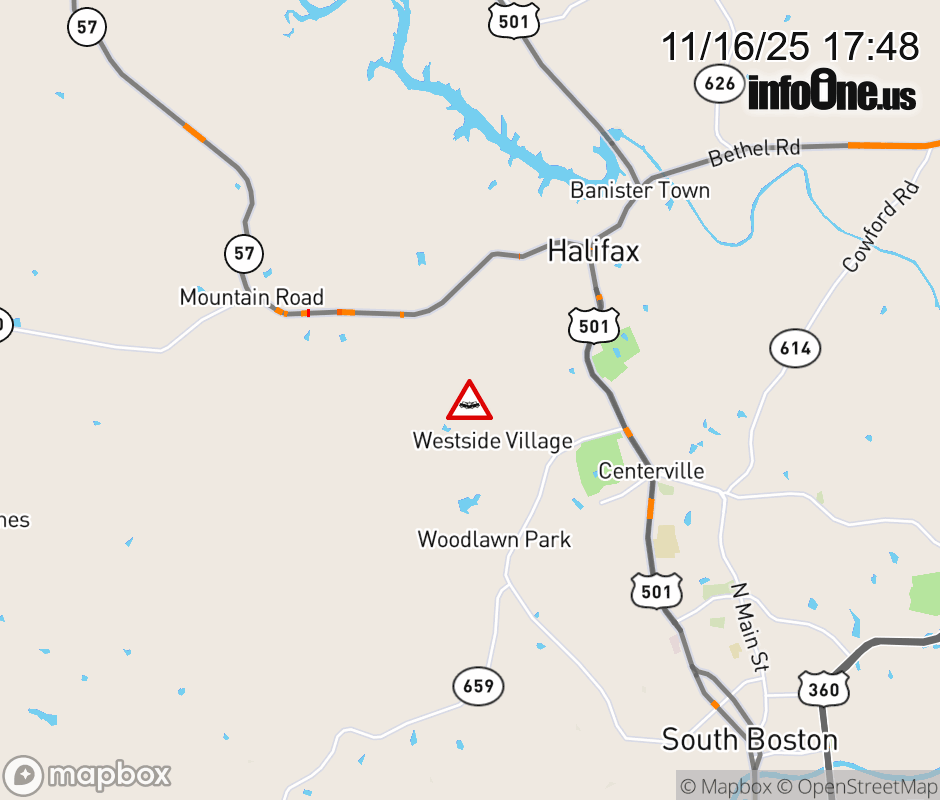 On Rt. 654 in the County of Halifax, in the vicinity of Cassada Ln; Rt. 930E/W (Halifax County), motorists can expect delays due to a vehicle crash. All east lanes are closed. All west lanes are closed. ![]() |