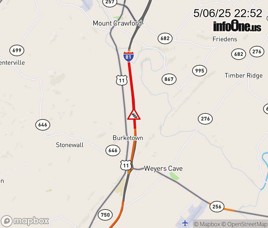 On I-81 South at mile marker 237 in the County of Rockingham, motorists can expect delays due to congestion. Traffic backups are approximately 2.0 miles. Updated: Tue 5/6/25 10:52 PM EDT ![]() Updated: Tue 5/6/25 10:52 PM EDT |