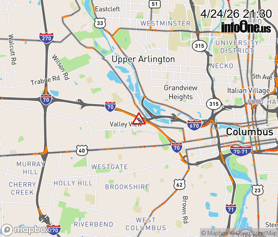 The 2 left lanes are closed on I-70 East at I-670 East, due to repairs/maintenance. Updated: Fri 4/24/26 9:30 PM EDT ![]() Updated: Fri 4/24/26 9:30 PM EDT |