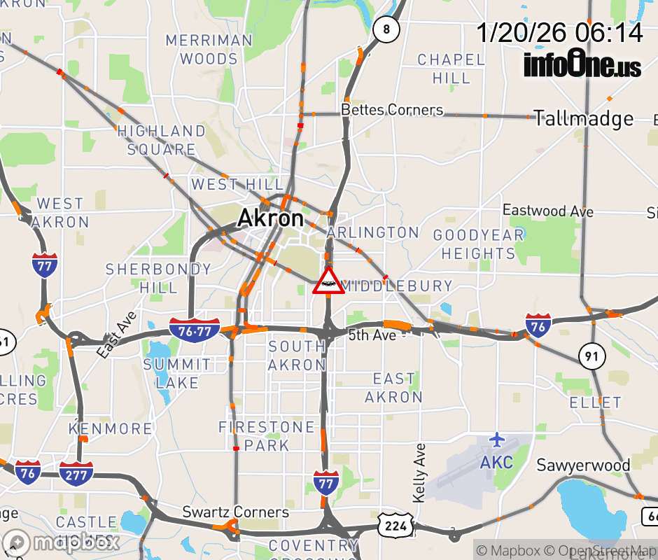 The left shoulder is blocked on SR-8 North at SR-18/Carroll St/Buchtel Ave, due to a crash. ![]() |
