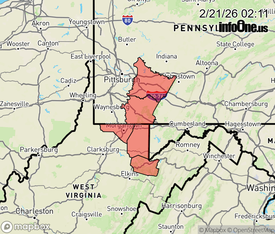 Canceled 2/21/26 12:01 PM Winter Storm Watch issued February 21 at 2:10AM EST until February 24 at 1:00AM EST by NWS Pittsburgh PA * WHAT... An extended period of snow for high terrain. More than 6 inches of snow is favored for Sunday through Monday. * WHERE... Portions of southwest Pennsylvania and northern West Virginia. * WHEN... From late tonight through late Monday night. * IMPACTS... Travel could be very difficult. The hazardous conditions could impact the Monday morning and evening commutes. * ADDITIONAL DETAILS... Highest accumulations are most likely for grassy surfaces in the high terrain. Snow totals may vary largely from valleys to ridgetops. Snow most likely to stick to roads and sidewalks Sunday night. ![]() |