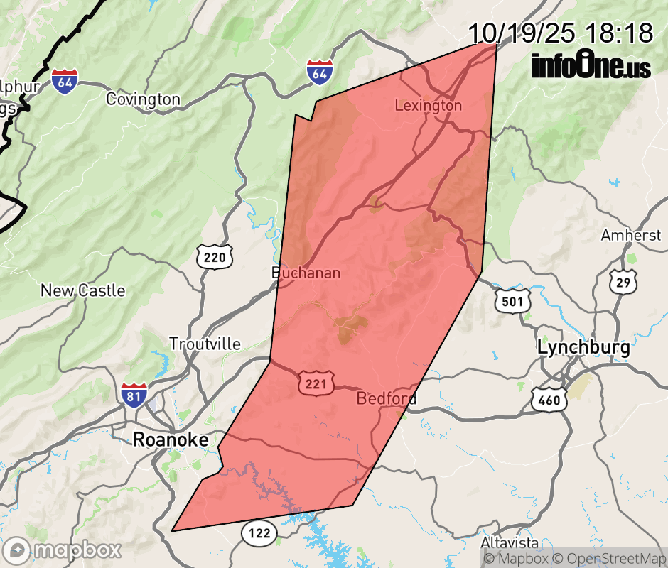 Canceled 10/19/25 6:45 PM Special Weather Statement issued October 19 at 6:13PM EDT by NWS Blacksburg VA At 613 PM EDT, Doppler radar was tracking strong thunderstorms along a line extending from 6 miles southwest of Collierstown to near Montvale to Boones Mill. Movement was northeast at 40 mph. HAZARD...Wind gusts up to 50 mph. SOURCE...Radar indicated. IMPACT...Gusty winds could knock down tree limbs and blow around unsecured objects. Locations impacted include... Lexington... Buena Vista... Bedford... Buchanan... Glasgow... Stewartsville... and Big Island. ![]() |