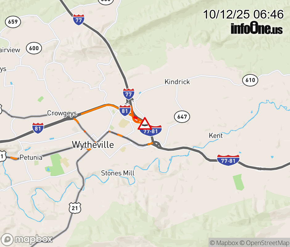 On I-81 at mile marker 73.3 in the County of Wythe, motorists can expect delays due to a tractor trailer crash. The north left shoulder, left lane, and center lane are closed. Updated: Sun 10/12/25 6:46 AM EDT ![]() Updated: Sun 10/12/25 6:46 AM EDT |