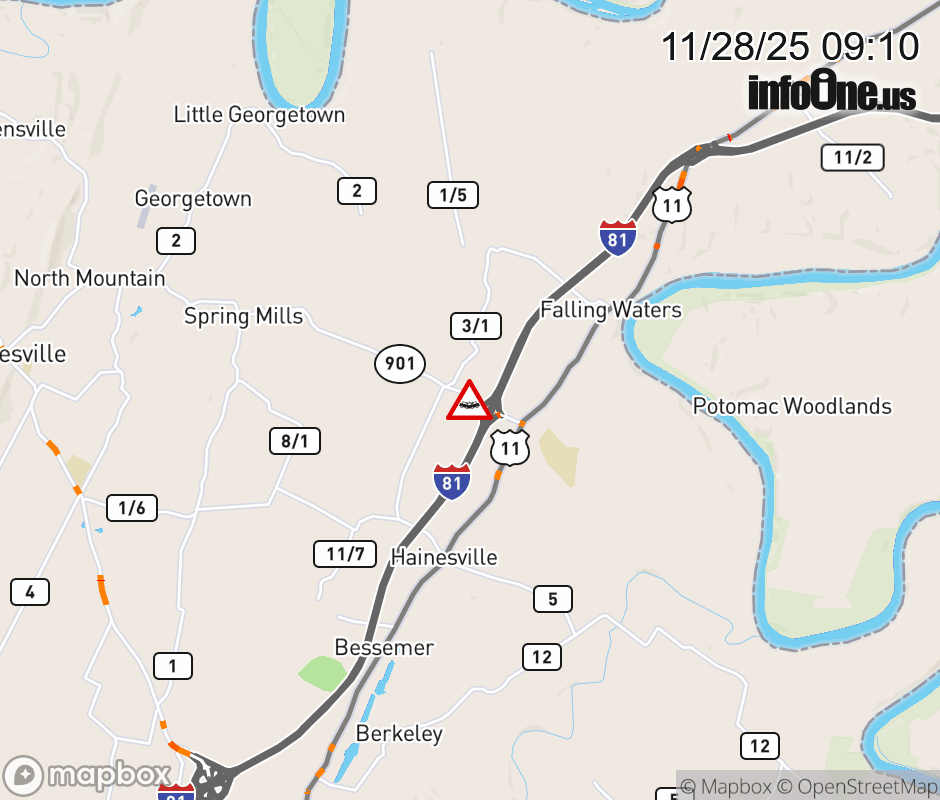 Vehicle Crash on WV-901 (Hammonds Mill Rd) & T J Jackson Dr in Falling Waters. The southbound road is closed. Updated: Fri 11/28/25 9:10 AM EST ![]() Updated: Fri 11/28/25 9:10 AM EST |