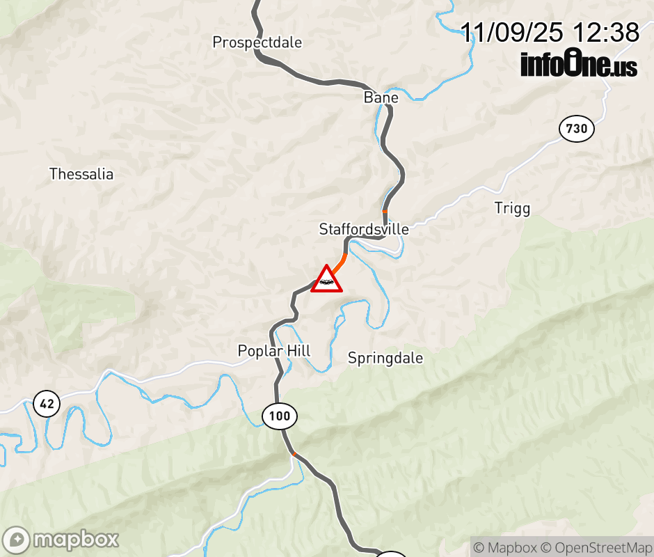 On VA-100 in the County of Giles, in the vicinity of Wabash Rd; Rt. 659N/S (Giles County), motorists can expect delays due to a vehicle crash. All north lanes are closed. All south lanes are closed. ![]() |