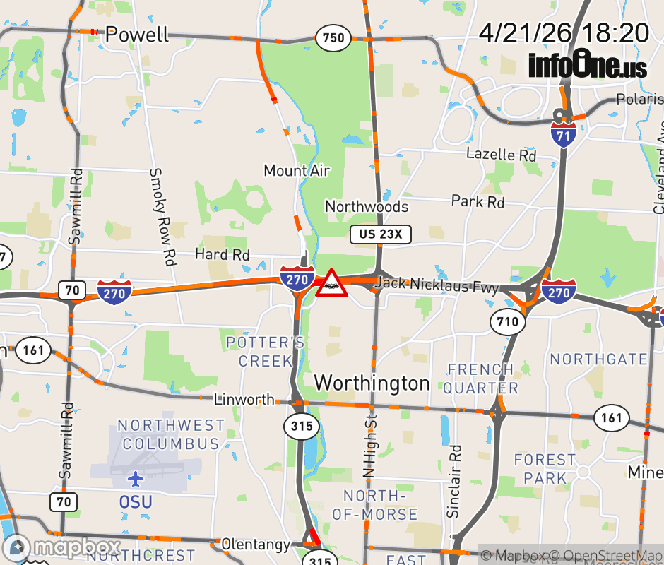 The right shoulder is blocked on I-270 East Collector beyond SR-315, due to a crash. Updated: Tue 4/21/26 6:20 PM EDT ![]() Updated: Tue 4/21/26 6:20 PM EDT |
