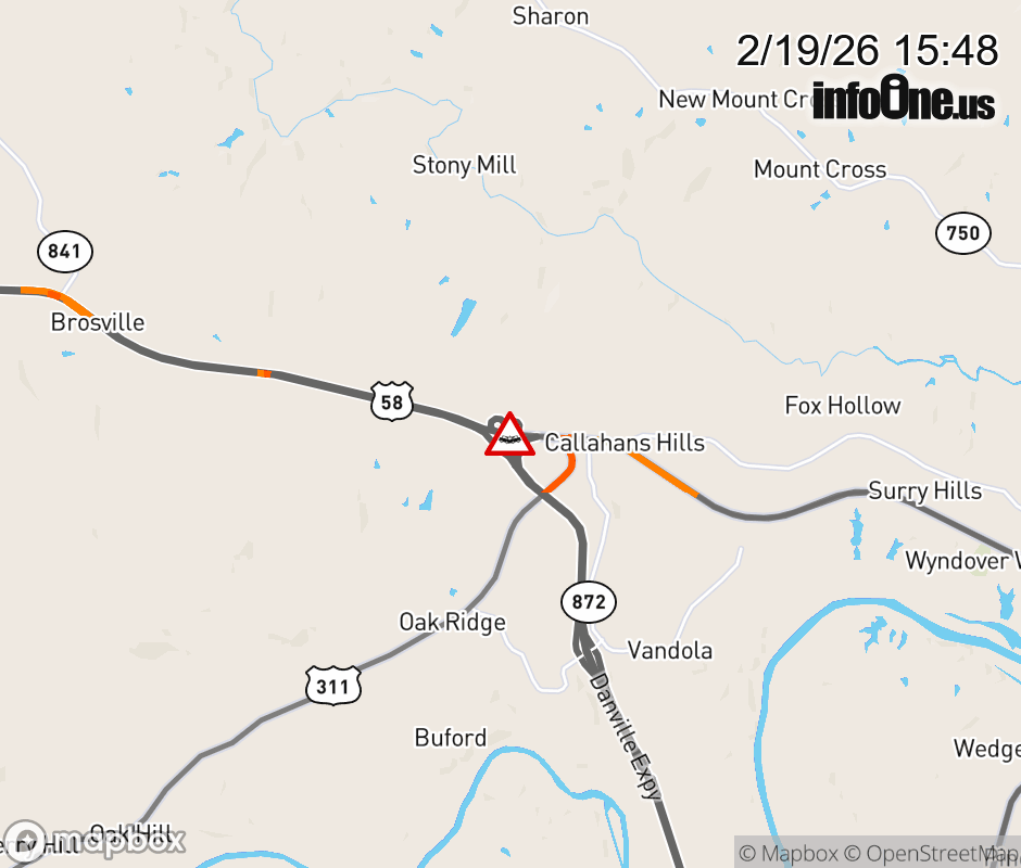 On BUS US-58 West in the County of Pittsylvania, in the vicinity of Martinsville Hwy; U S 58 Byp; Ramp Intersection, motorists can expect delays due to a vehicle crash. Lane closures exist. Updated: Thu 2/19/26 3:48 PM EST ![]() Updated: Thu 2/19/26 3:48 PM EST |