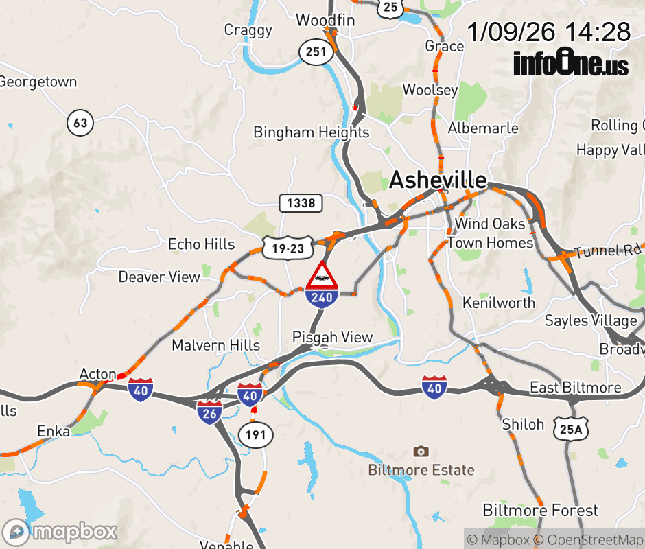 The left lane is closed at Exit 2, US 19/23 BUS (Haywood Road). ![]() Updated: Fri 1/9/26 2:28 PM EST |