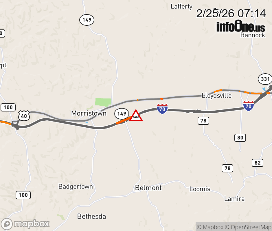 The left lane is blocked on I-70 East beyond SR-149/Belmont/Morristown, due to a crash. Updated: Wed 2/25/26 7:14 AM EST ![]() Updated: Wed 2/25/26 7:14 AM EST |