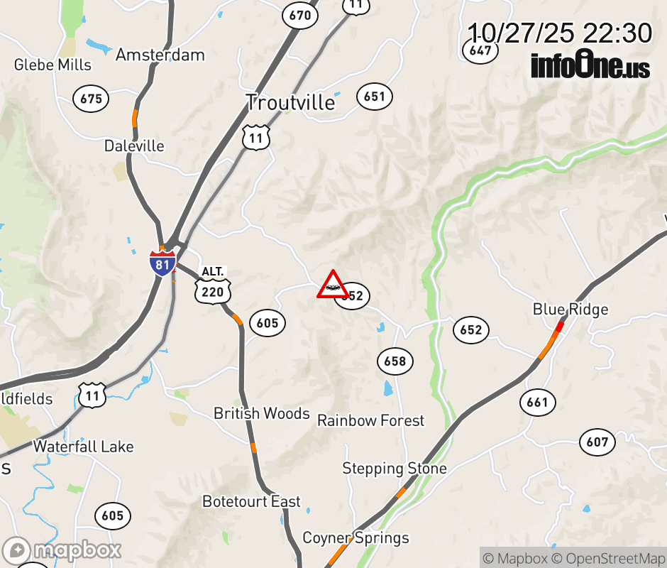 On Rt. 652 in the County of Botetourt, in the vicinity of N Oakwood Rd; Rt. 791N/S (Botetourt County), motorists can expect delays due to a vehicle crash. All east lanes are closed. All west lanes are closed. ![]() |